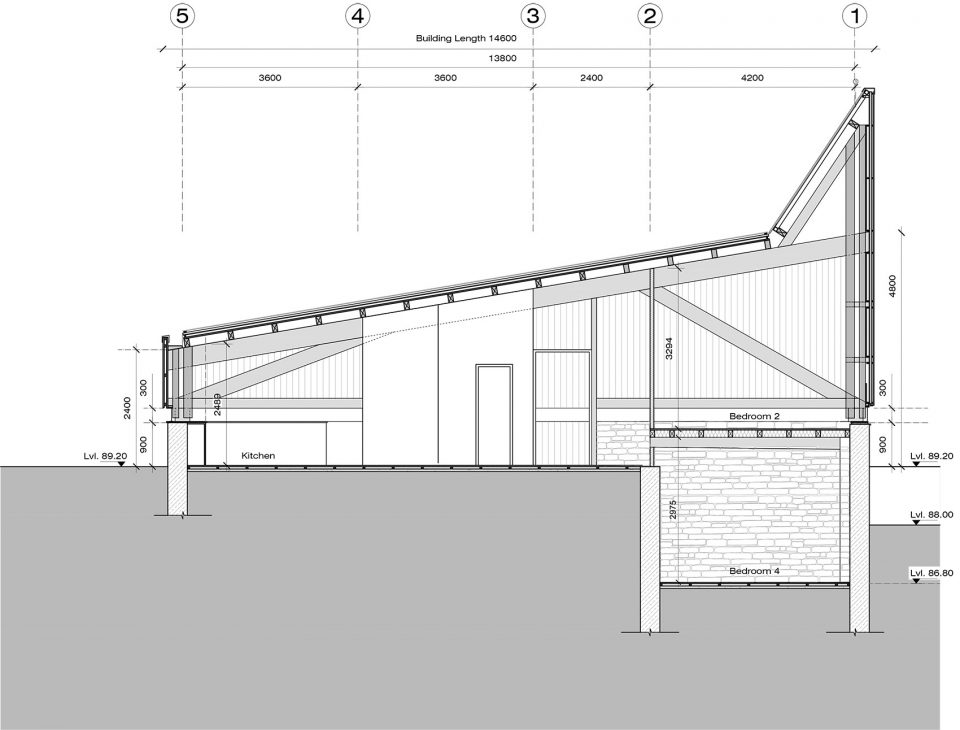 空間由三個(gè)不同的層次組成,每一個(gè)都大約占用14.5米x3.6 m的自然地形,外立面的連續(xù)橫窗使得周圍的果園和Almora鎮(zhèn)的壯觀景色一覽無余。這個(gè)開窗像是一個(gè)裂縫,成為現(xiàn)場挖出的裸露的干石墻基地和當(dāng)?shù)孛麨閠hun木材包覆之間的過渡。