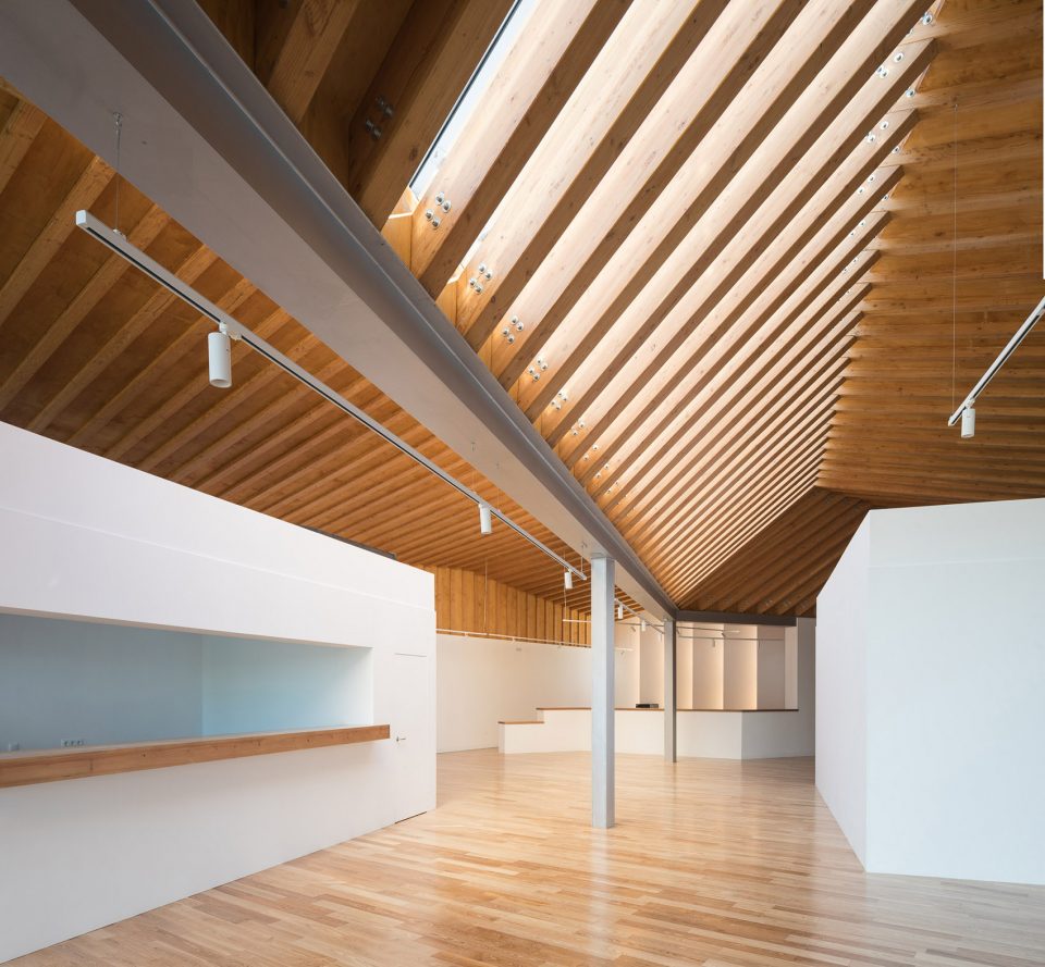 間接的自然光線和天窗光線交替穿梭進(jìn)昏暗的室內(nèi)空間,形成獨(dú)特的內(nèi)部空間表達(dá)。交錯(cuò)的光亮將人的視線逐漸引入室外的湖泊景觀。隨光照的變化,空間景象展現(xiàn)出可逆的內(nèi)部環(huán)境。交替的木結(jié)構(gòu)和鋼結(jié)構(gòu)與環(huán)境融為一體,建筑也與周圍自然環(huán)境和諧共處。