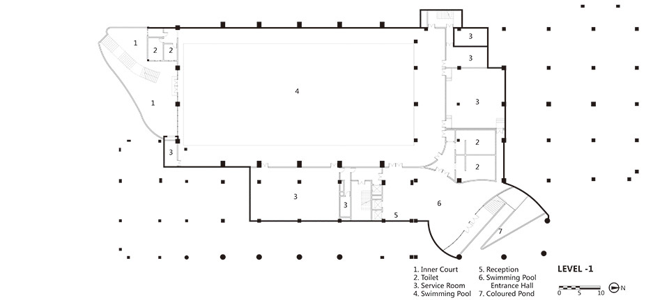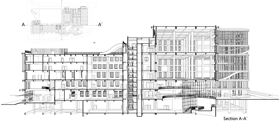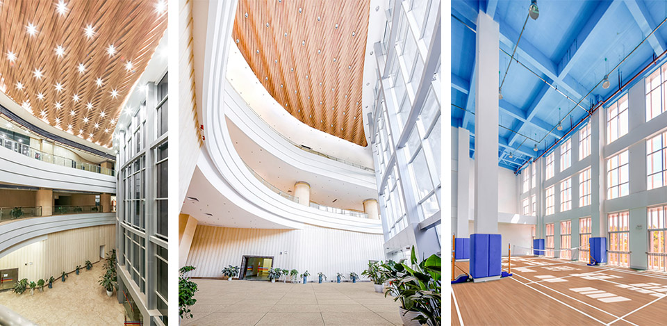 我們希望通過這個項目喚起我們的父輩及下一代的歸宿感。農業(yè)生產是那個時代“集體式生活”的標志,自然地貌便是這一代人集體記憶的背景。我們通過對建筑空間在“地面”層面上的疊加,再現了自然地貌:在城市層面上,由于本項目地處城市擴張的邊界,位于較低的洼地地形,面鄰一個保留的綠化高地,我們在建筑手法上引入一系列上下錯開的水平樓板來使這兩種極端的地貌形成空間上的對話;在建筑尺度,我們轉譯了這種拓撲關系為一種多層樓板的空間類型,例如地下室空間轉折到首層入口層,接著又垂直延伸到二層空間,并不斷交錯向上;在細部層面,我們使用了木紋鋁方通遮陽板系統將豐富的地景引入到室內,是對本土的竹材結構建筑形制所做出的回應。