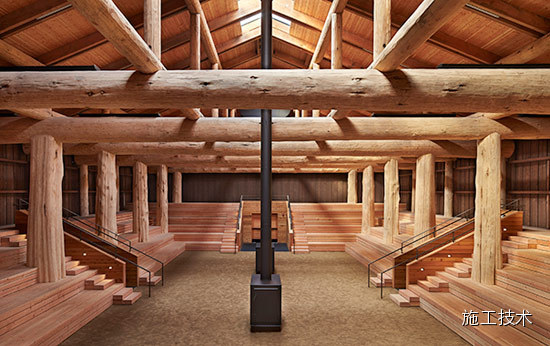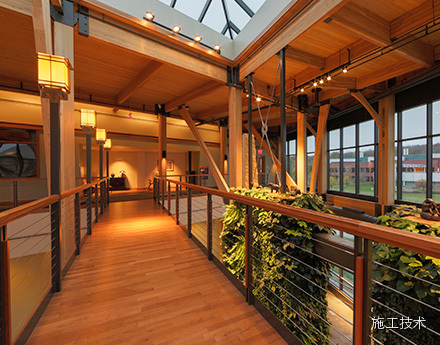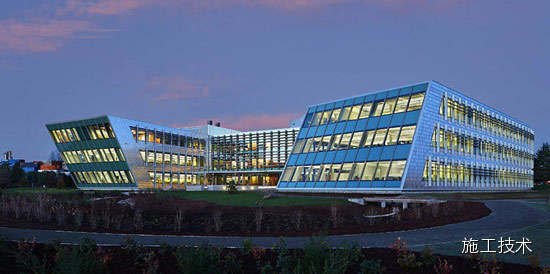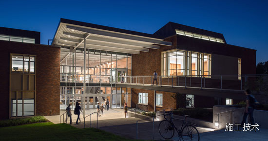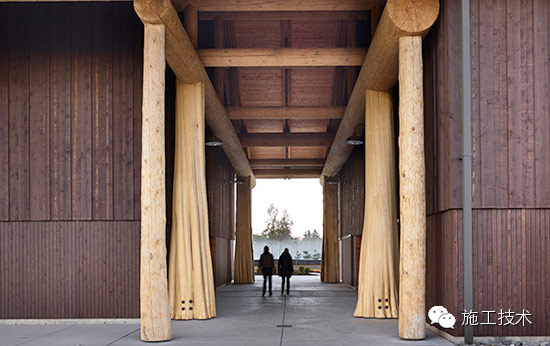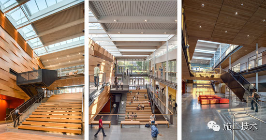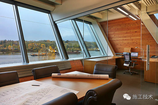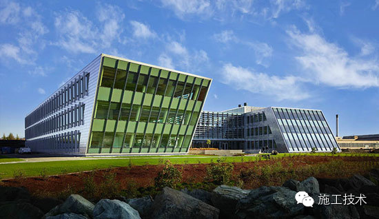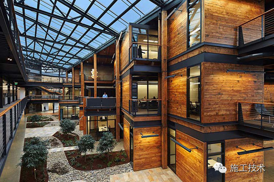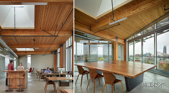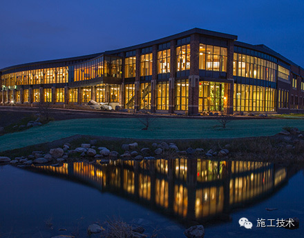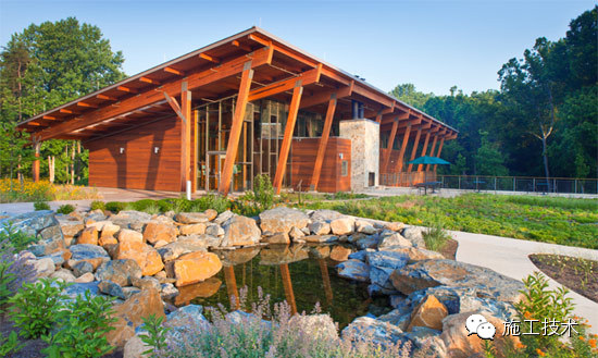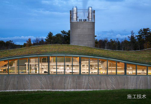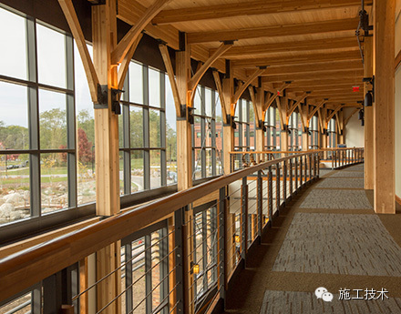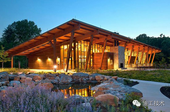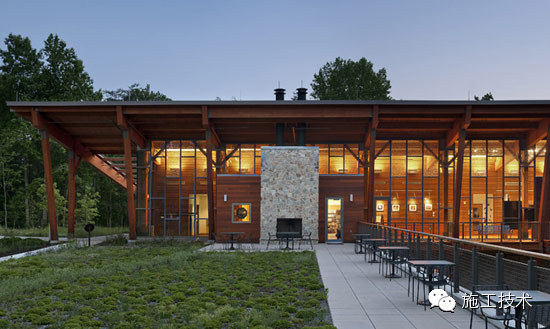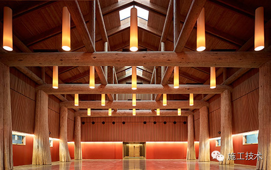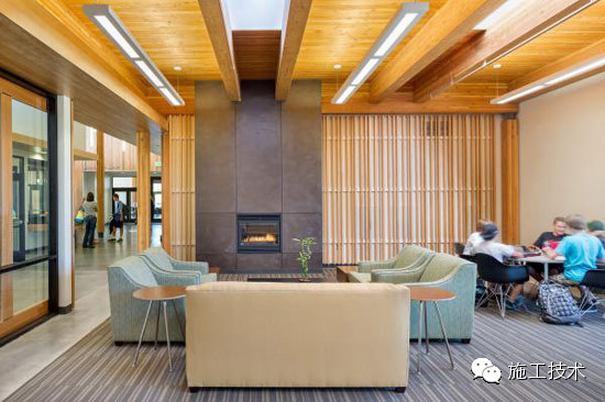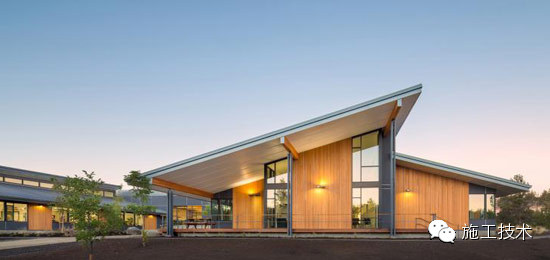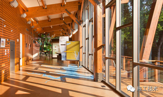 建筑物的桁架為膠合層壓板,從而優(yōu)化了這種可再生資源的結(jié)構(gòu)價(jià)值。膠合板消耗能源少于鋼筋混凝土或鋼材,可用于更長(zhǎng)的時(shí)間跨度,可承受重負(fù)荷,并且擁有復(fù)雜 的形狀。該建筑通過(guò)了LEED環(huán)境保護(hù)認(rèn)證,包括一套可再生的膠合板結(jié)構(gòu)系、節(jié)水管道夾具、利用可回收的當(dāng)?shù)夭牧稀⑹覂?nèi)擁有豐富的自然光線以及高效的機(jī)械 系統(tǒng)、照明和外表皮。
