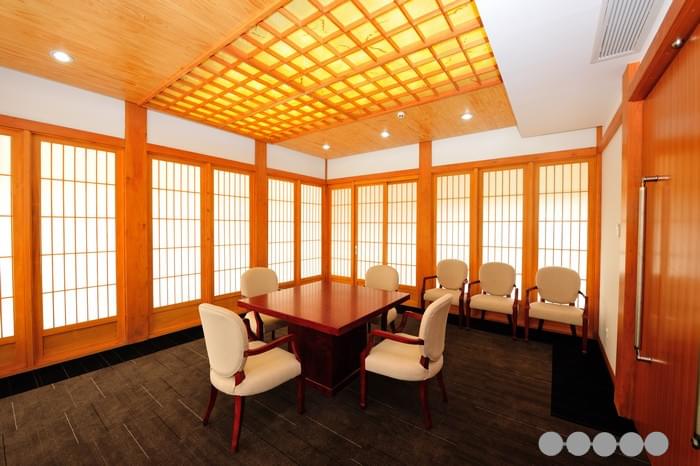 百花園日式木建筑四周有日式的圍廊和陽臺,但采用的是花旗松膠合主柱和鐵杉防腐木地板。一樓和二樓均采用了大面積的和式移動門窗,裝飾以日本進口的幛子紙,透光而不透視,而所有日式門窗均采用溫潤細膩、耐腐抗變形的加拿大黃柏。循花旗松實木樓梯拾級而上,是日式茶室、辦公會客室、休息室和秘書室等功能區(qū)劃。整個室內(nèi)裝飾以針葉材實木板條和流白為主,地面是十分日本式的青石板,頂部的日式燈具均用直紋的花旗松實木在工廠定制而成。