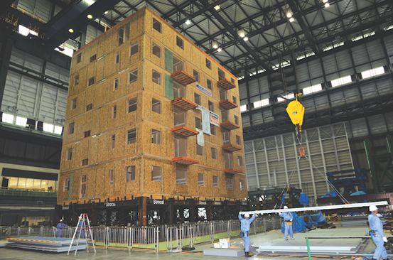 圖:早年在日本三木市進行的六層足尺寸木結(jié)構(gòu)振動臺試驗,模擬了阪神地震強度,結(jié)果證明建筑物結(jié)構(gòu)完整性良好