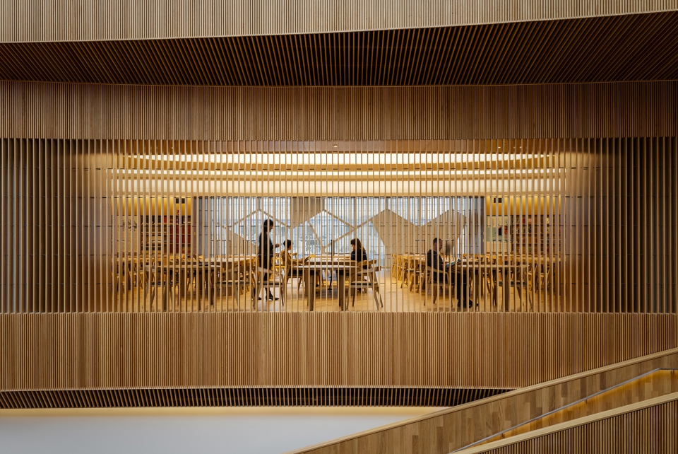 圖書館共有六層,分布著各種空間,比如數(shù)字空間,模擬空間,群體空間以及個人互動空間。圖書館頂層是大閱覽室,建筑師在設(shè)計時,把它構(gòu)想成藏在圖書館的珠寶盒,人們可以在這兒潛心研究,尋找靈感。進(jìn)入大閱覽室之前要先經(jīng)過一個過渡空間,過渡空間光線柔和,聲效優(yōu)良。室內(nèi)利用木質(zhì)格柵而非實體墻壁來環(huán)繞空間,這樣既保證了隱私,又有一定的可見度。陽光透過木條的縫隙照亮了中庭和西立面之間的空間。