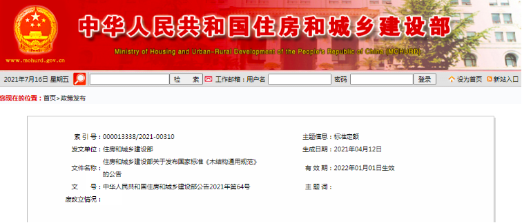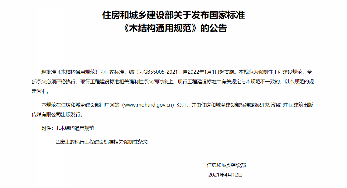 近日,住房和城鄉(xiāng)建設(shè)部正式發(fā)布國家標(biāo)準(zhǔn)《木結(jié)構(gòu)通用規(guī)范》(GB55005-2021)的批準(zhǔn)公告,自2022年1月1日起實(shí)施。