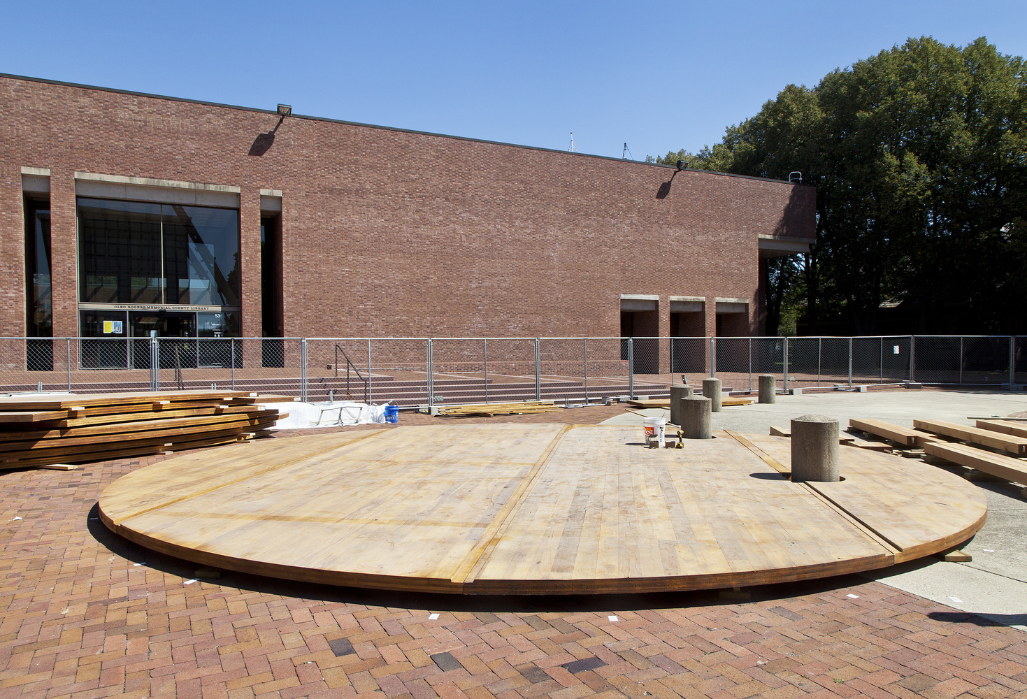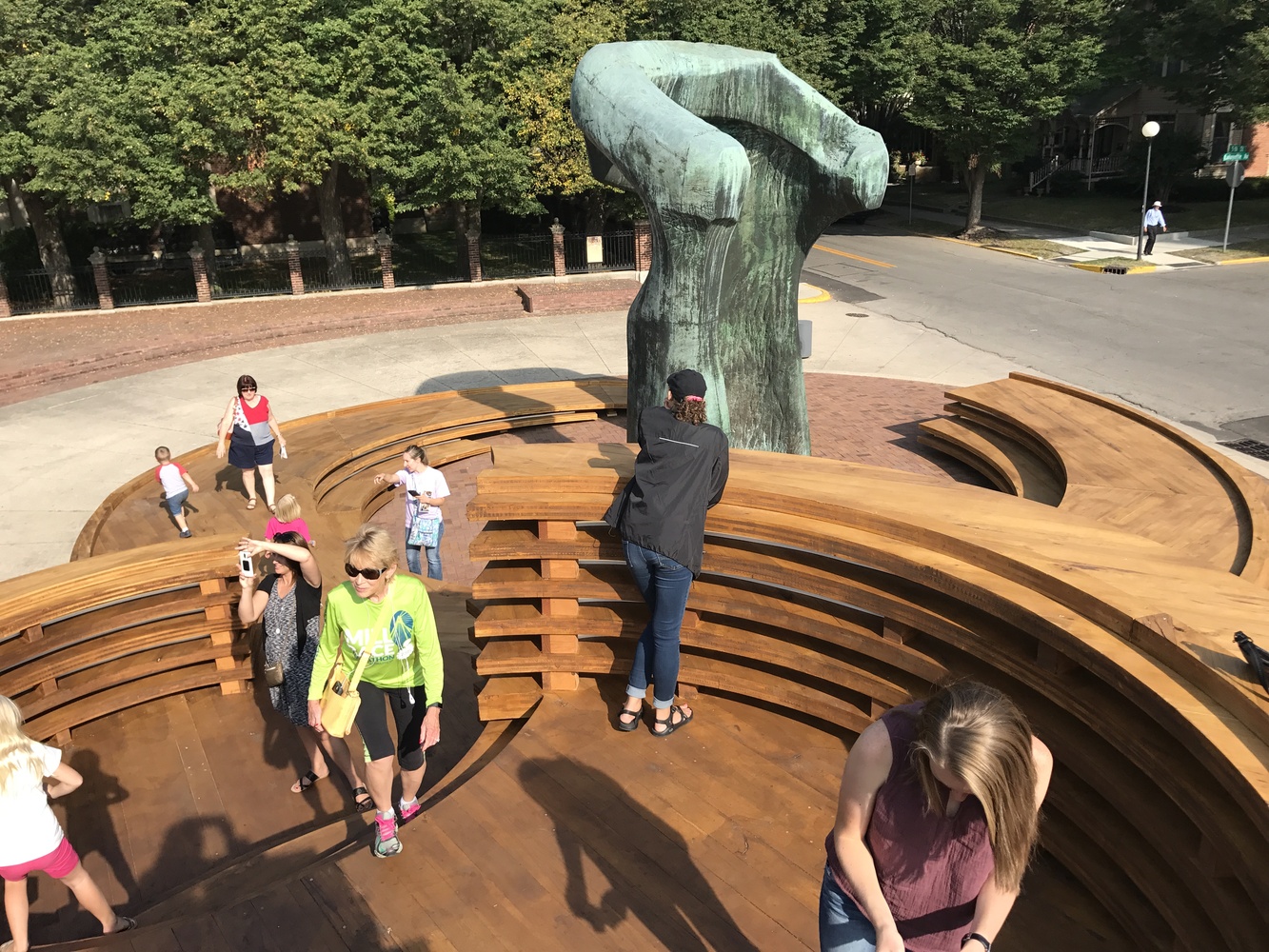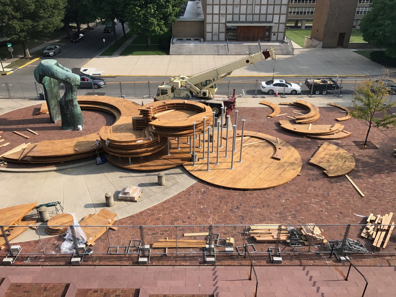 該設(shè)施為社區(qū)提供了一個(gè)不管從字面上還是隱喻上來(lái)看,都聚集,交流并且振奮人心的地方。從位于東半部的摩爾雕塑周邊開(kāi)始,大型木材轉(zhuǎn)盤(pán)組成了一系列向西上升的底座。
