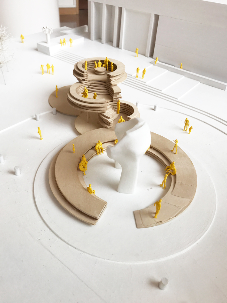 IKD給Cleo Rogers紀(jì)念圖書(shū)館廣場(chǎng)的設(shè)計(jì)方案,題目是對(duì)話基座 (Conversation Plinth),其目的是為了向 J Irwin Miller 致敬并慶祝哥倫布社區(qū)。它的形式是受 Miller House 談話的正廳的啟發(fā), 同時(shí)他的“基座”抬高并強(qiáng)調(diào)了場(chǎng)地周?chē)闹匾貥?biāo)建筑-貝聿銘設(shè)計(jì)的圖書(shū)館,由薩里寧設(shè)計(jì)的第一個(gè)基督教堂,和亨利.摩爾設(shè)計(jì)的 Large Arch。