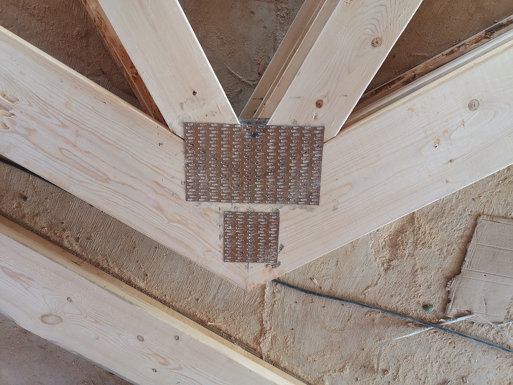 齒板連接主要用于輕型木結(jié)構(gòu)建筑中規(guī)格材制成的輕型木桁架節(jié)點連接。輕型木桁架是北美輕型木結(jié)構(gòu)體系中屋架體系的主要結(jié)構(gòu)形式。其特點是支撐形式靈活,桁架間距較密,通常小于600 mm。在桁架連接處應(yīng)用齒板,可以較快的進(jìn)行桁架中各弦的定位。即在工廠中拼裝好一品桁架后,將桁架平放,同時用專門的壓力機(jī)將齒板直接壓入桁架中各條弦之間的連接處。齒板連接其最大的優(yōu)點是提高了施工效率,保持了木材的完整性。同時齒板作為連接件,與木材之間表現(xiàn)較好的協(xié)同作用,塑性性能良好。